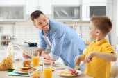 Zdjęcie "Troskliwy tata zegarki syna jedzenie." może być wykorzystywane do celów osobistych i komercyjnych zgodnie z warunkami zakupionej licencji Royalty-free. Obraz jest dostępny do pobrania w jakości wysokiej rozdzielczości do 5760x3840.