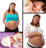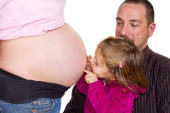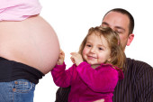 dziecko całuje brzuch kobiety w ciąży na czarnym tle
