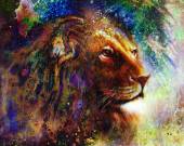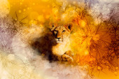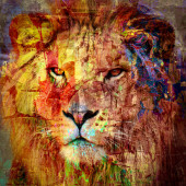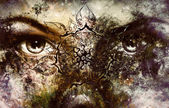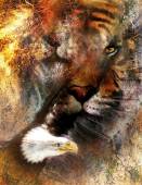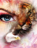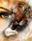 tiger collage with water woman fairy, on color abstract background, rust structure, wildlife animals.