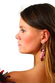 atrakcyjna młoda kobieta przytulanie poduszkę w kształcie serca. na tle