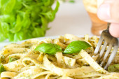 makaron z pesto na stół szkło zielony