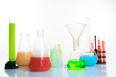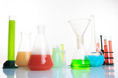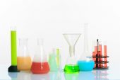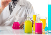 ręce, trzymając probówek z pierwiastków chemicznych.