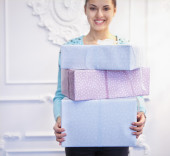 Szczęśliwa młoda kobieta z Boże Narodzenie obecny w jej ręce