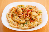 Pierożki makaron z sosem pomidorowym i pietruszka.