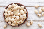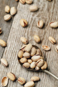 Prażone i solone pistacje na drewniane tła