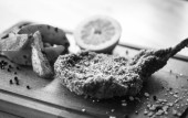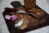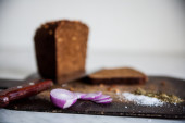 chleb i cebuli na cięcia pokładzie na białym tle soli