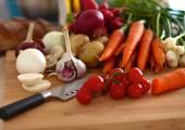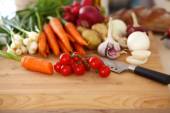 Świeżych organicznych warzyw na stole z nożem do gotowania