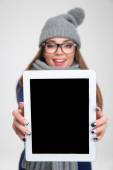 Uśmiechający się pokazując ekran komputera puste tabletka