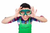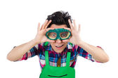 Człowiek ogrodnik z kwiatami na białym