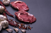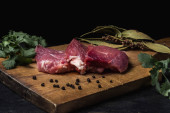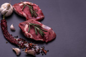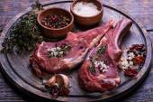Surowy befsztyk z kością z przyprawami na drewniane tła