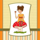 ładna młoda dziewczyna siedzi na grzybie i rozmawia z małym ptaszkiem