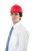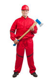 pracownik uderzenie z ciężkiego młotka na białym tle