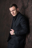 wealthy man, dark background, short-haired man, businessma, a man in a dark sweater, blazer, looking directly into the camera, stern look, business, brick wall, dark background, red brick, bright smile,