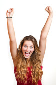 Sukces / Zwycięzca biznes kobieta na białym tle. Śmieszne zdjęcie komfortowa s