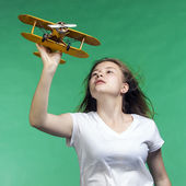 Ładny dziewczyna bawi sie z modelem samolotu