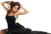 Zmysłowa dziewczyna pozuje. łapka na szarym tle.