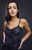 sexy brunetka pozowanie w jedwabnej sukni klasycznego.