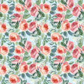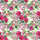 Watercolor seamless pattern with flowers: blue, purple, white. Abstract floral pattern. Bright and colorful background for textile, fabric, birthday card, wedding invitation, etc.