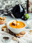 Zdjęcie "Zupa dyniowa z marchwi i domowe grzanki w glinianych garnków, ru" może być wykorzystywane do celów osobistych i komercyjnych zgodnie z warunkami zakupionej licencji Royalty-free. Obraz jest dostępny do pobrania w jakości wysokiej rozdzielczości do 5760x3840.