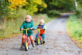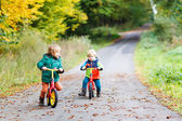Dwa małe dziecko chłopców z rowerami w lesie jesienią