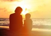 matka i dwoje dzieci spaceru na plaży o zachodzie słońca