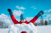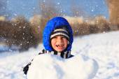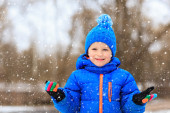 mały chłopiec cieszyć się pierwszy śnieg w zimie przyrodzie