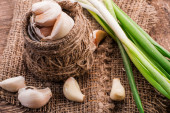 Koła cebula, świeża zielona cebula z czosnkiem na pokładzie drewnianym tle
