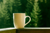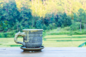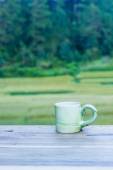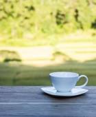 Filiżanka z herbatą na stole nad polami ryżu.