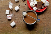 Filiżankę kawy i słodycze na czarnym tle drewniane
