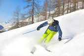 narciarstwo na świeżym śniegu w sezonie zimowym w piękny słoneczny dzień