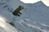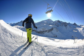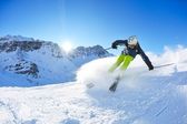 narciarstwo na świeżym śniegu w sezonie zimowym w piękny słoneczny dzień