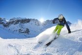 narciarstwo na świeżym śniegu w sezonie zimowym w piękny słoneczny dzień