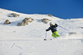 Zdjęcie "narciarstwo na świeżym śniegu w sezonie zimowym w piękny słoneczny dzień" może być wykorzystywane do celów osobistych i komercyjnych zgodnie z warunkami zakupionej licencji Royalty-free. Obraz jest dostępny do pobrania w jakości wysokiej rozdzielczości do 5760x3840.