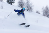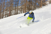 narciarstwo na świeżym śniegu w sezonie zimowym w piękny słoneczny dzień