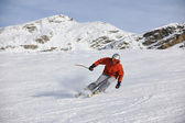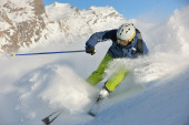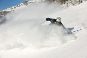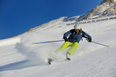narciarstwo na świeżym śniegu w sezonie zimowym w piękny słoneczny dzień