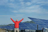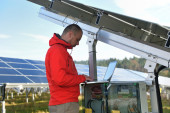 Inżynier korzystający z laptopa w polu elektrociepłowni paneli słonecznych