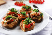 Zdjęcie "Pieczarki faszerowane na talerzu, na tle tabeli" może być wykorzystywane do celów osobistych i komercyjnych zgodnie z warunkami zakupionej licencji Royalty-free. Obraz jest dostępny do pobrania w jakości wysokiej rozdzielczości do 5760x3840.