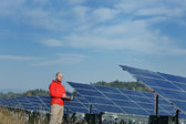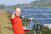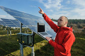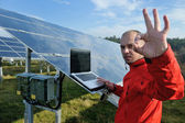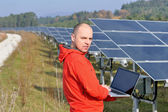 Inżynier korzystający z laptopa w polu elektrociepłowni paneli słonecznych