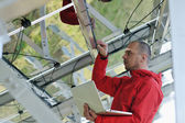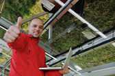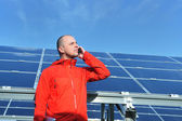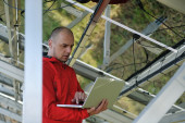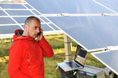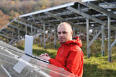 Inżynier korzystający z laptopa w polu elektrociepłowni paneli słonecznych
