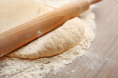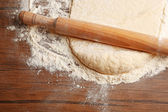 Ciasto na pizzę i wałek na drewnianym stole