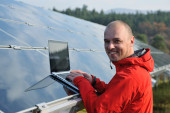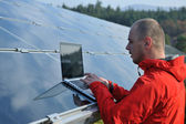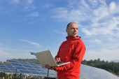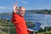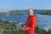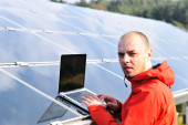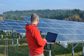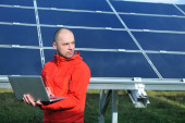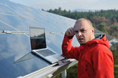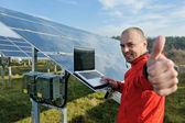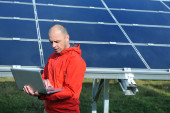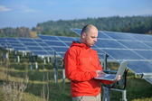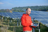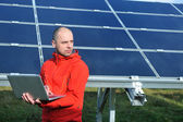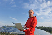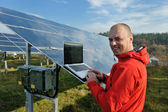 Inżynier korzystający z laptopa w polu elektrociepłowni paneli słonecznych
