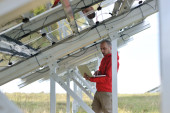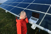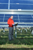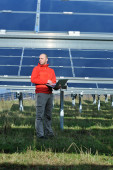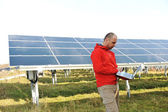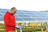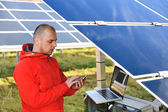 Inżynier korzystający z laptopa w polu elektrociepłowni paneli słonecznych