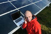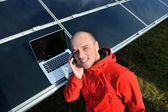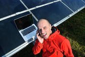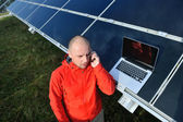 Inżynier korzystający z laptopa w polu elektrociepłowni paneli słonecznych