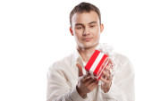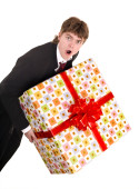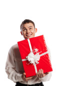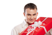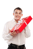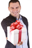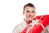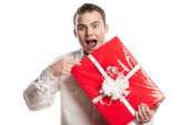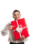 człowiek uśmiechający się wskazujący na na białym tle ofiara