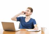 człowiek z kalkulatorem w jego biurku w biurze. rozmowy telefon