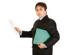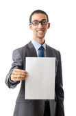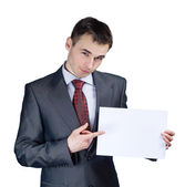 poważny biznesmen nowoczesne trzymając papier blank i pokazano przystanek