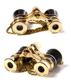 Czerwony teatr lornetki z złoty sznurek na białym tle, na białym tle