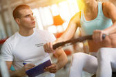 Kobiet ćwiczenia na piłkę w sali gimnastycznej przy pomocy instructo