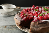 Bułka z masłem z polewą czekoladową i malin na tacę na drewniane tła