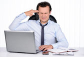 young attractive businessman sitting at office desk working on computer laptop suffering headache